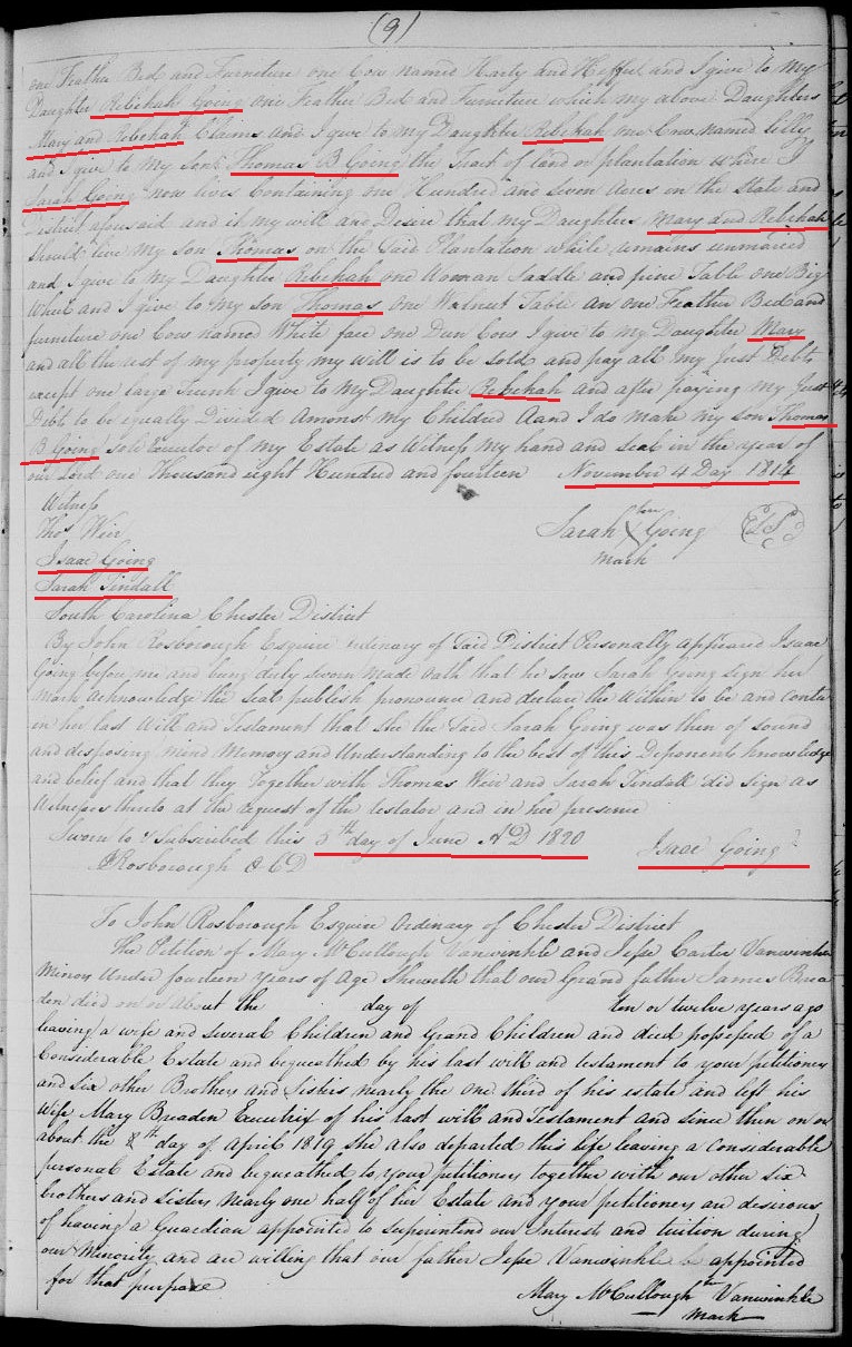 Sarah Goyen dies some time before June 5, 1820, when her will is entered into probate court in Chester County, SC.