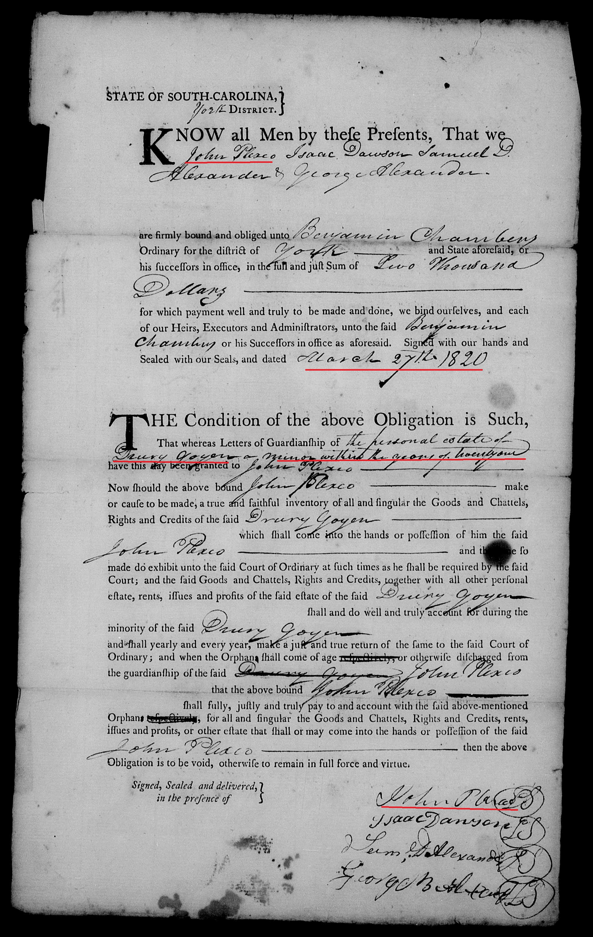 On March 27, 1820, the York County court appoints John Plaxco as guardian of Drury B. Goyen’s legal estate (to protect his assets from Elijah Goyen’s estate) as he was still legally a minor (under 21 years of age). 1820 March 27 – Appointed John Plaxco guardian Drury Goyen a minor he haveing been previously entered into a bond of two thousand dollars with Isaac Dawson, Samuel D Alexander and George B Alexander, securities for his faithfull performing said trust. Minutes and Journals,1814-1909. pg. 116. York Co, SC. https://www.familysearch.org/ark:/61903/3:1:939L-JX9H-YD?i=77&cc=1919417&cat=24663