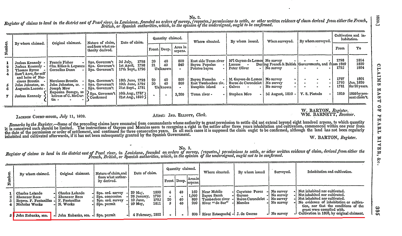 1819 Jackson Co, MS taxroll: William Eubanks, James Eubanks, and John Eubanks (This is the first year James Eubanks shows on tax rolls – possibly means he turne 21 this year – making him born about 1797)