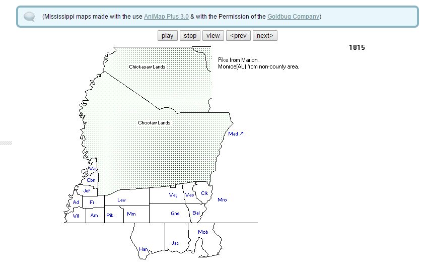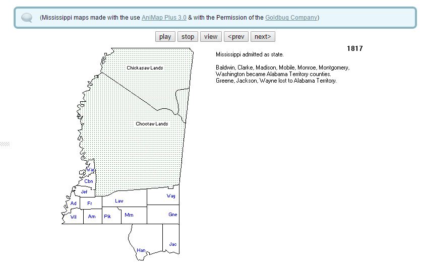 In 1817, John Eubanks Jr has joined father John Eubanks in Jackson Co, MS. The United States admits the State of Mississippi and sets its border with Alabama as seen below: