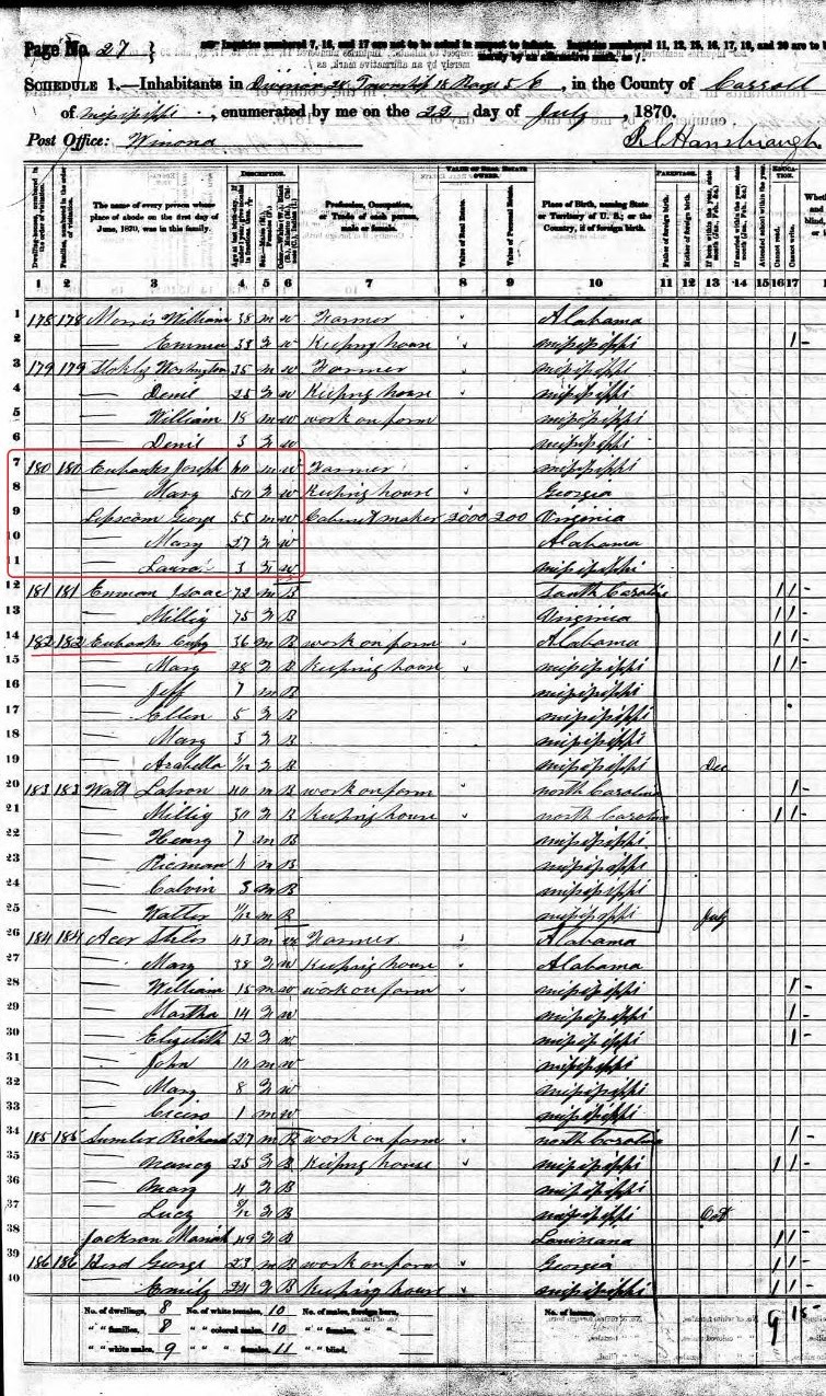 Francis Eubanks b. abt 1800 (Possibly a son of John Eubanks – he moved to Carroll Co, MS prior to Joseph Eubanks – and according to US Census reports, is age to be an older brother of Joseph Eubanks).