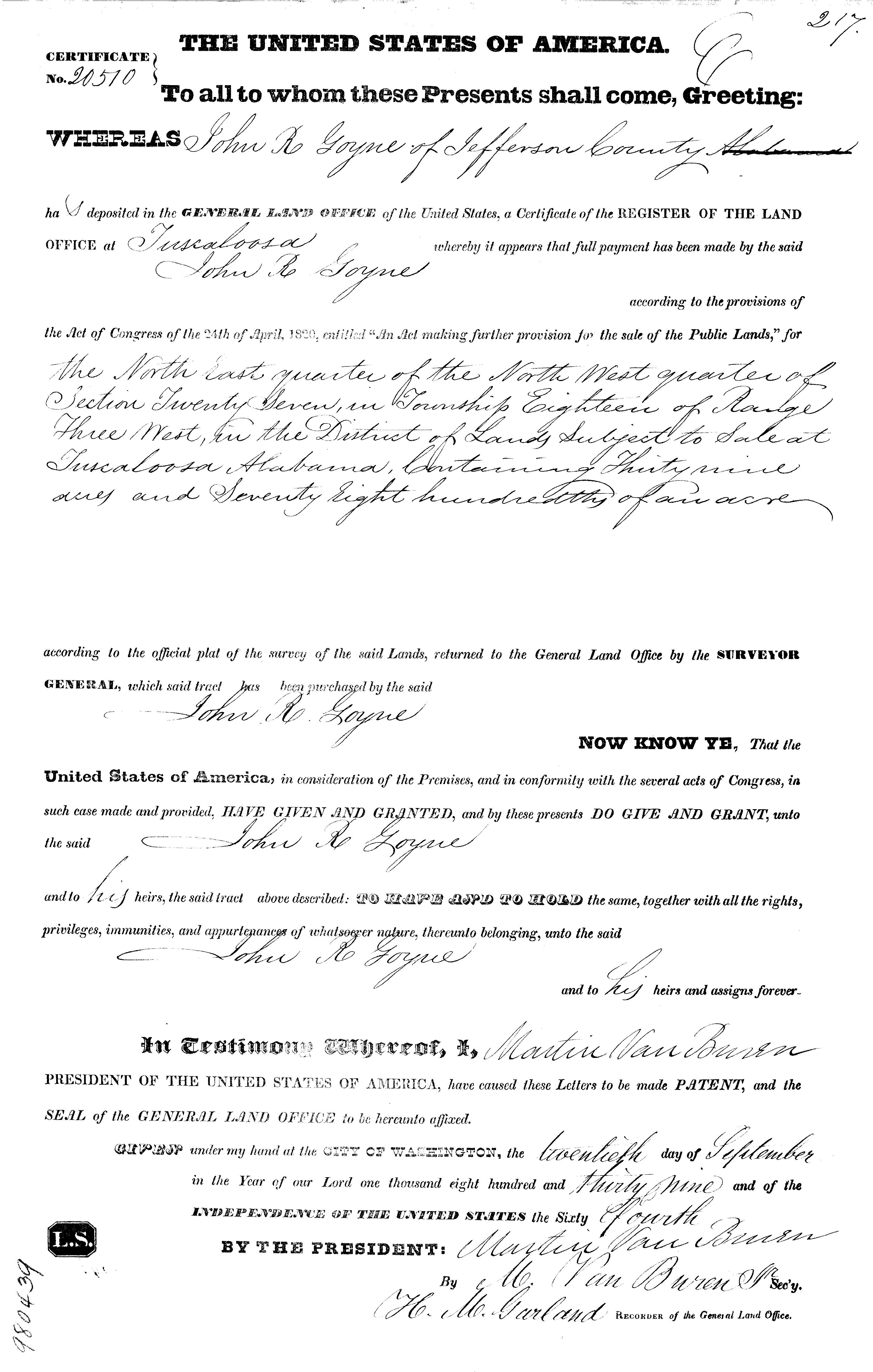 JOHN MARTIN, Lewis Nabers, Thomas Carrol, Commissioners, to John R. Goyne, all of Jeff. Co., Ala. $1606. 80 acres being that part of SE ¼ of Sec 9, TP 18, R 3W, which lies N of a line running through the center of said quarter section from E to W. John Martin, Lewis Nabers & Thomas Carrol were appointed Commissioners by the Orphan’s Court of Jeff. Co., to sell certain lands of Stephen Byars, deceased. By virtue of this appointment the above tract of land was sold to the highest bidder at public auction. Dated Apr. 7, 1838. Ack. jointly by the 3 Commissioners before B.E. Grace, Clk. Co. Ct. Apr. 16, 1838. Filed Apr. 16, recorded May 14, 1838. B.E. Grace, Clk. Co. Ct.
