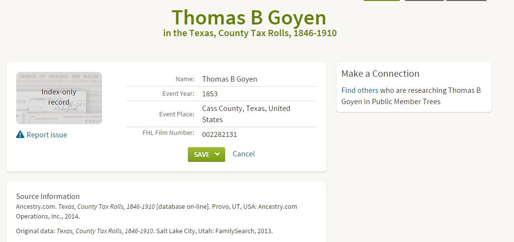 1853 Cass County Texas tax rolls for Thomas B Goyen