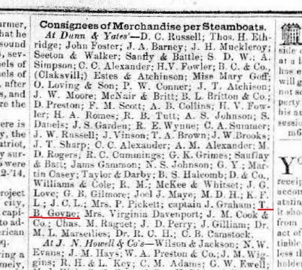 1850 Census notes probably Thomas Goyne age 25 yrs, as a clerk in Jefferson TX. Antebellum Jefferson, Texas: Everyday Life in an East Texas Town. By Jacques D. Bagur. pg. 279. https://books.google.com/books?id=G_J7BfSgbj8C&pg=PA279&lpg=PA279&dq=jefferson,+texas,+T+B,+Thomas,+Goyne&source=bl&ots=xW5GImKlC4&sig=t_aBmrJRTYYdBdUPdG3pV0ScXi4&hl=en&sa=X&ved=0ahUKEwiPiu76rvjSAhUJ5oMKHYeEAjMQ6AEIGTAA#v=onepage&q=jefferson%2C%20texas%2C%20T%20B%2C%20Thomas%2C%20Goyne&f=false