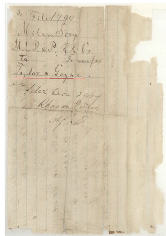 1846 Oct 20: Richard M Turner and Thomas Goyne of the first part, and Harrison Hale and Abraham Murdock merchants and partners under the name of Hale & Murdock of the 2nd part … Turner and Goyne in consideration of one thousand dollars to them secured by the said Hale and Murdock draft of even date herewith one Toomer Gay H of Mobile, Ala for three hundred and thirty three and 35/100 dollars due March 15, 1847 and the said Hale and Murdock two notes of even date herewith each for $333.33 dollars one due 1st March 1848 and one due first March 1849 each payable to the said Turner and Goyne … who granted to said Hale and Murdock the following parcels of land in Westport, County of Lowndes, MS … lots 2, 3, block 1, lot 7, block 31, lot 3, block 2, lot 8, block 39, lots 7, 9 in block 37, lots 6 and 7 in block 4, all of block 13, all of fractional block 15, all of blocks 17, 21, 28, 43, 58, also all of fractional blocks 14, 16, also an equal undivided half of block 6, lots 2, 3, 4, 5, 6, 7, 8, 9 in block 5. … signed: R M Turner, Thomas B. Goyne. bk 22, p 442. Lowndes Co, MS. https://www.familysearch.org/ark:/61903/3:1:3Q9M-C3QC-63QW-B?i=244&cat=250537 , https://www.familysearch.org/search/catalog/250537?availability=Family%20History%20Library (Index)