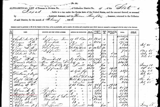 1871 May 2 – T. B. Goyne is part of a group that brings Jefferson Insurance Company, incorporated in town of Jefferson, Cass County, Texas that offers insurance for “steamboats and all other river crafts, and boats of every kind, and all goods, wares and merchandise, slaves, bullion, money and other property, against all maritime and river risks, and upon houses, stores and other buildings, goods, wares . . . against loss or damage by fire”. Inventory of the county archives of Texas : Marion County, no. 158. p. 72-73 https://texashistory.unt.edu/ark:/67531/metapth25247/m1/78/zoom/?resolution=2&lat=2328&lon=600