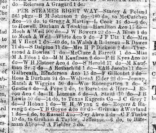 1869 Oct 6 T B Goyne and Co consignee of merch per steamer Julia A Rudolph in Shreveport LA