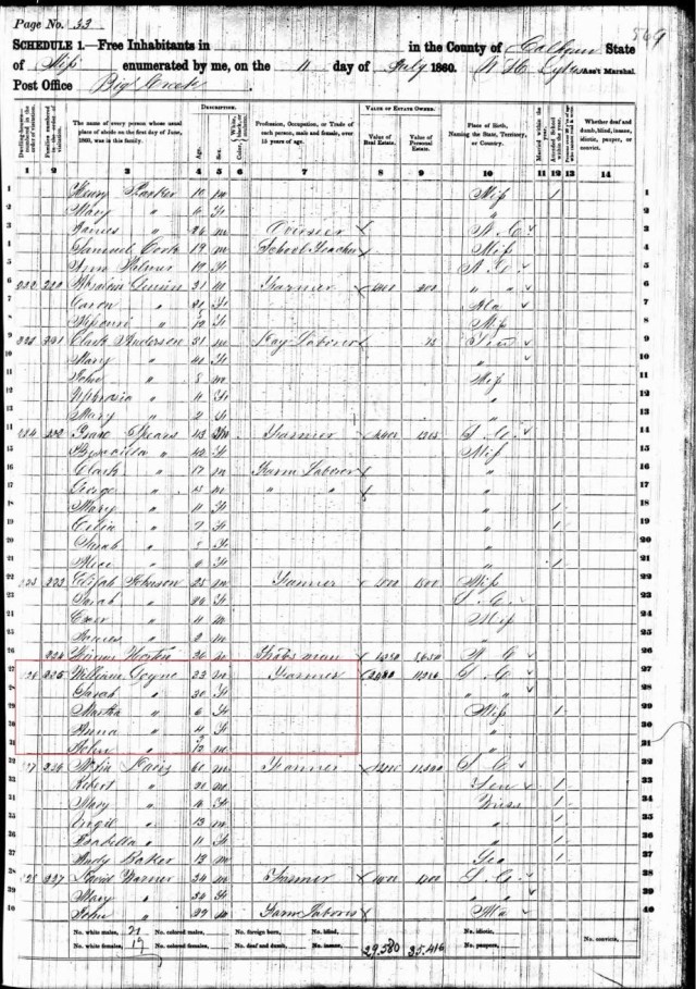 By 1880 they had moved back to Calhoun County, Mississippi – likely back on William W Goyen’s farm.