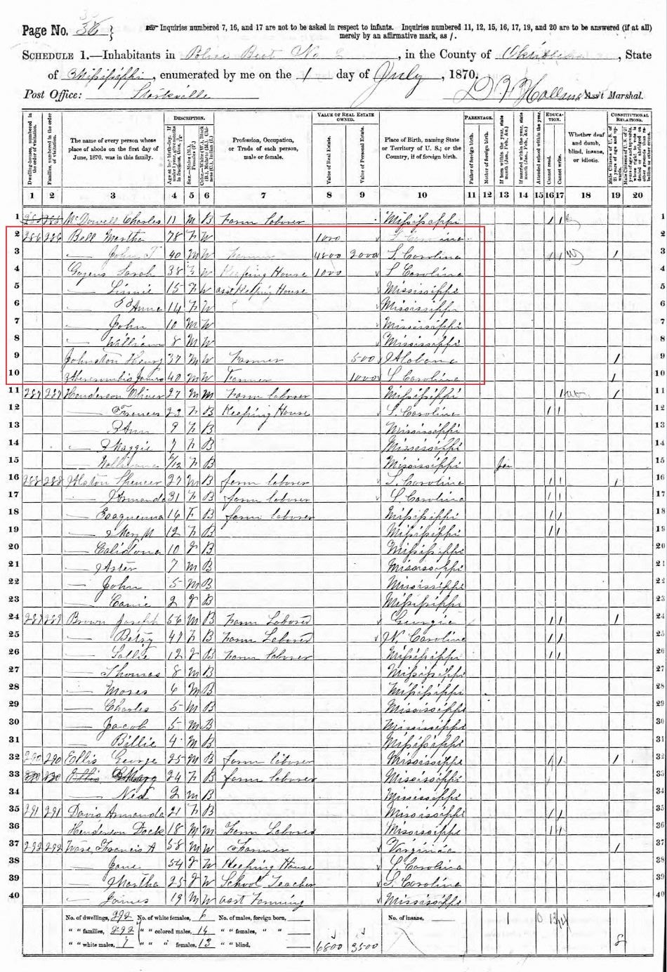 John T Bell 40 Farmer b. in S Carolina
