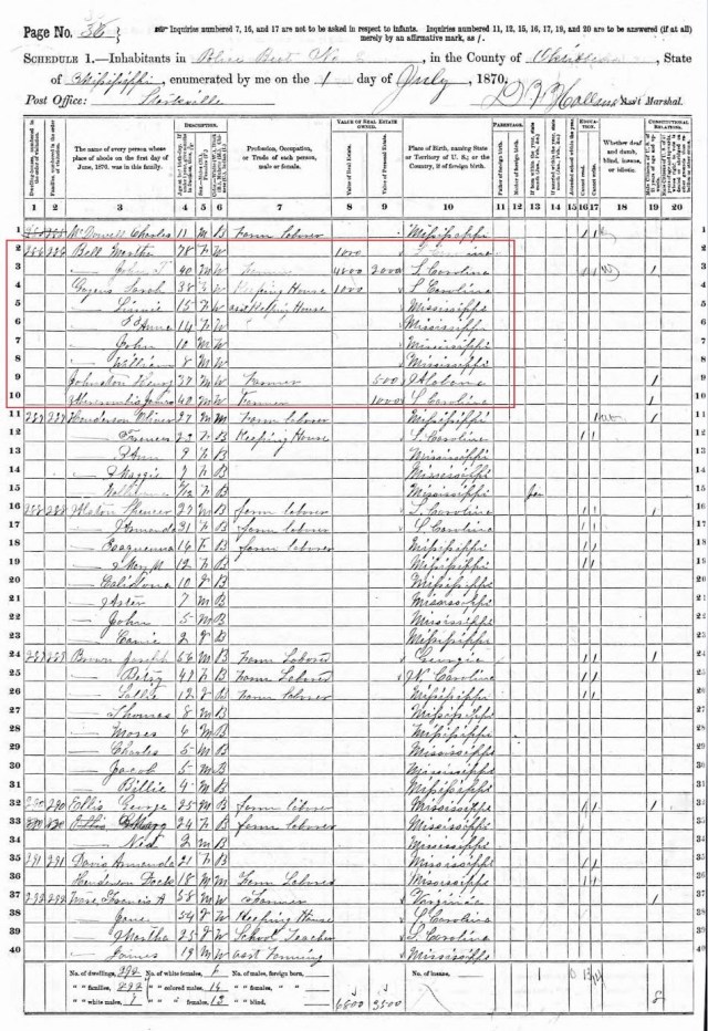 (1870 US Census – John Bell Goyen’s father, William W. Goyen, has been killed in the Civil War. Sarah Martha Bell Goyen has moved with her 4 children Elizabeth, Anna, John, and William, to Starkville, Mississippi back to her childhood home, the home of her father Hugh Bell who died in 1864. Sara and her family are living with her mother – Martha Watt Bell).