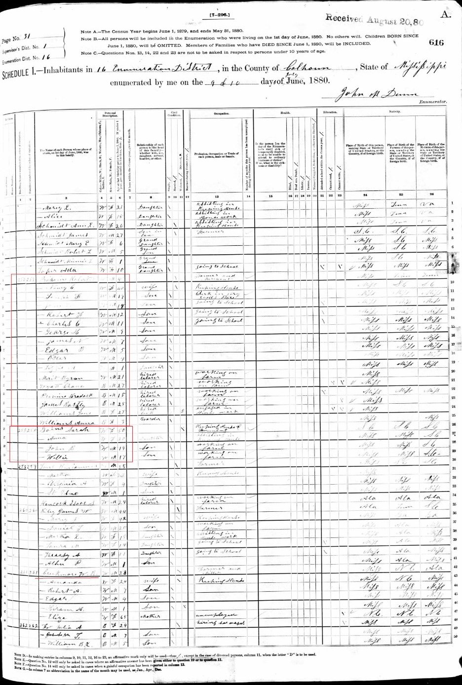 1880 US Census in Calhoun County, MS