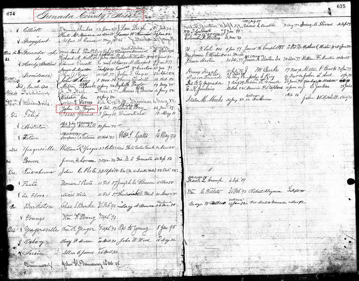 John B. Goyen begins to show up on Calhoun County and Grenada County, Mississippi tax rolls in the mid and late 1880s.