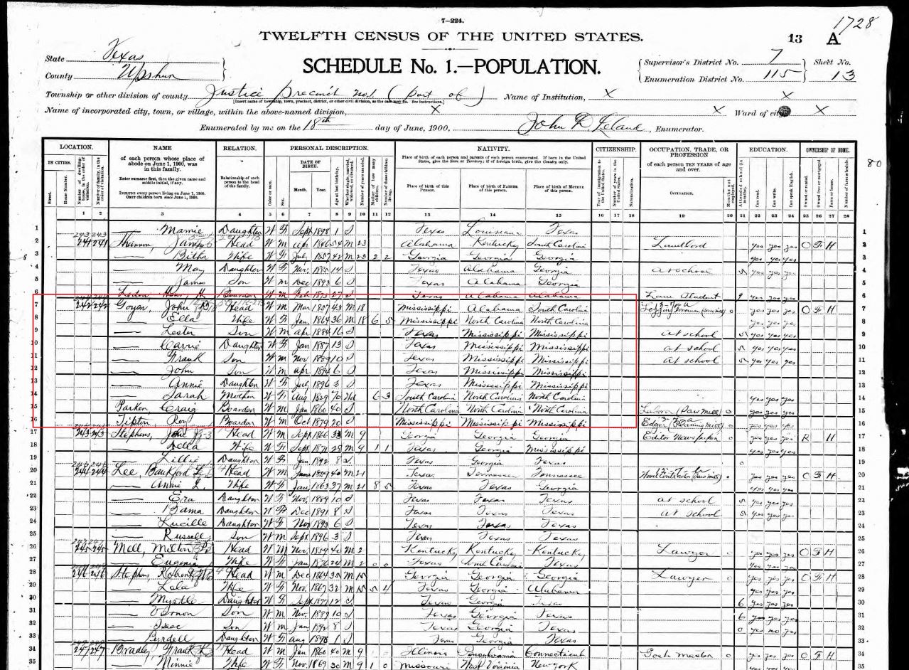 (1900 US Census in Upshur County, Texas – when John Bell Goyen’s family was living in Gilmer – see family photo at top of page. His mother Sarah Goyen born 1829 is living at his home, with Craig Parker – likely a relative of his wife Ella Green Parker – and John Bell Goyen’s nephew Roy Tipton (Clarence Leroy Tipton) – who was Martha Elizabeth Goyen’s oldest son. Also listed are his children Leslie, Carrie, Frank, John, and Annie. John Bell Goyen is working as a Logging Foreman at the sawmill at this time). https://www.ancestry.com/sharing/29701924?h=ae89e8 , https://www.ancestry.com/sharing/29701932?h=002c36