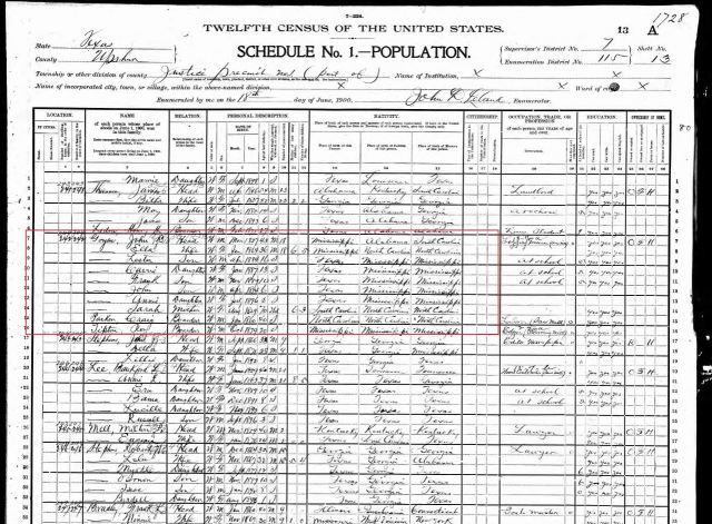 The 1900 US Census in Upshur County (Gilmer), Texas show’s John Bell Goyen’s family.
