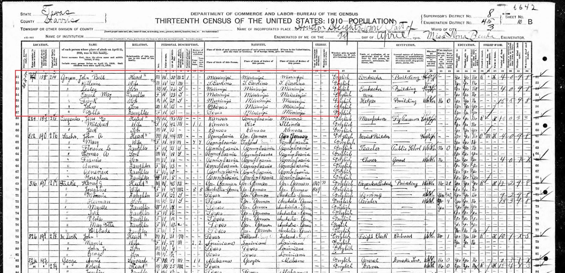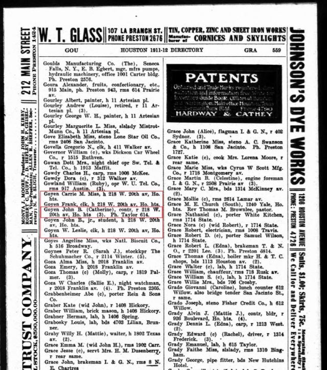 (1910 US Census – John Bell Goyen has moved his family to Houston, Texas – living on 20th Street. He has married his second wife, listed as Catherine, and is now listed as working as a Building Contractor. His children Leslie, Carrie, Frank, John, and Ella are also living with him).
