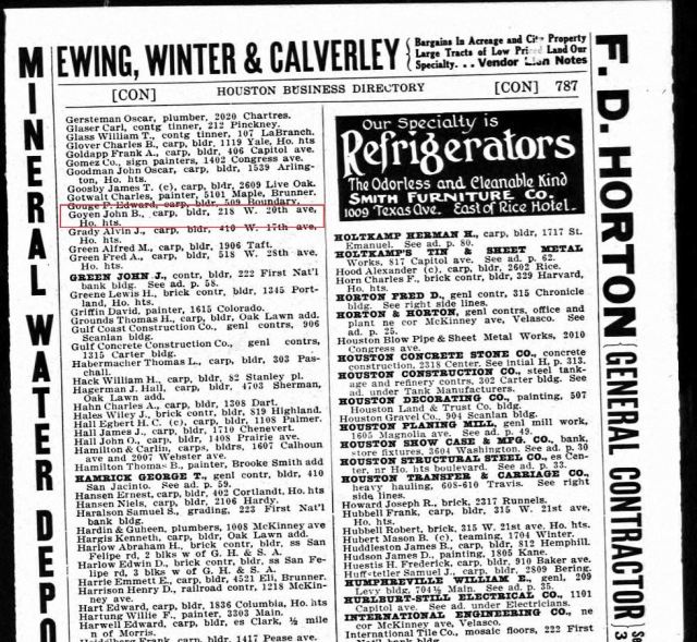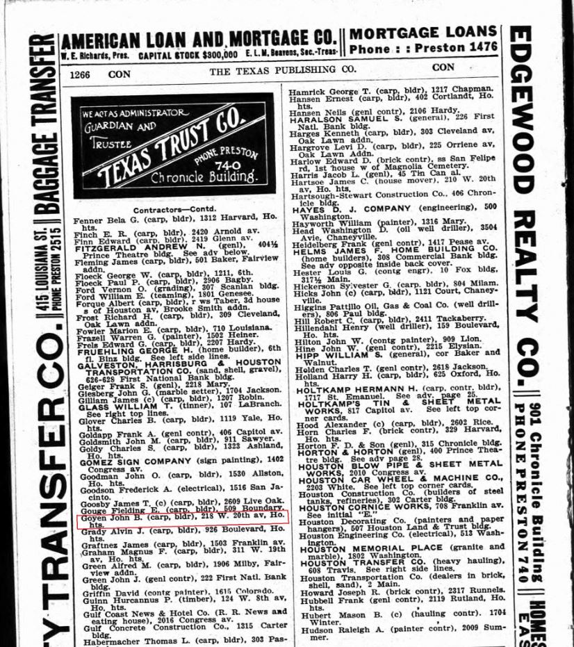 John Bell Goyen started a successful Building Contractor business in Houston, Texas, that his son William Leslie Goyen continued after John’s death in August of 1911.