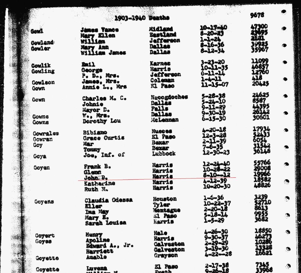 - Frank Bell Goyen – b Nov 1889 – d. 1940 in Harris County, Texas in an auto accident, never married