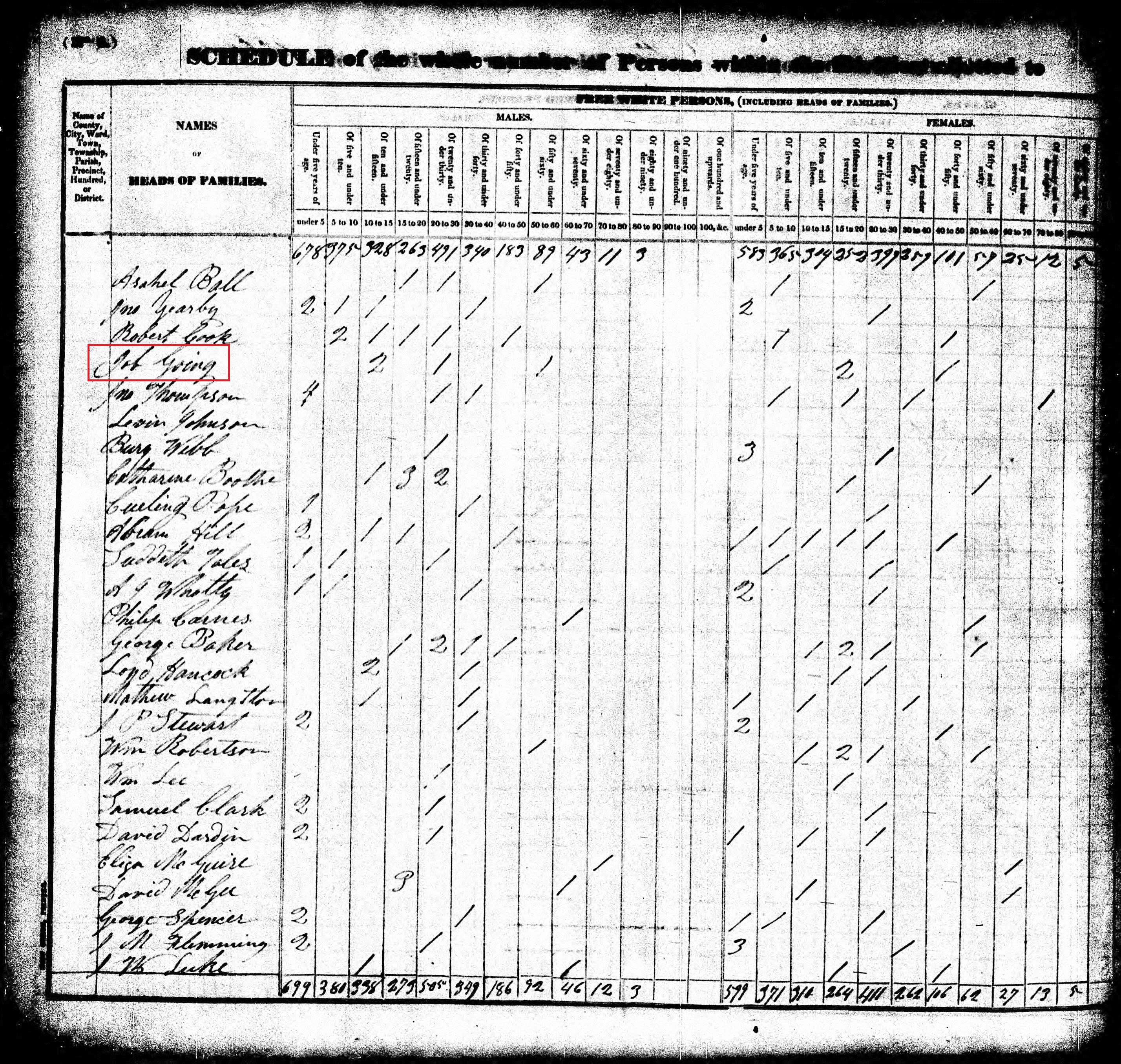 - James Robert Going abt 1828–1850 m. Malinda Booth