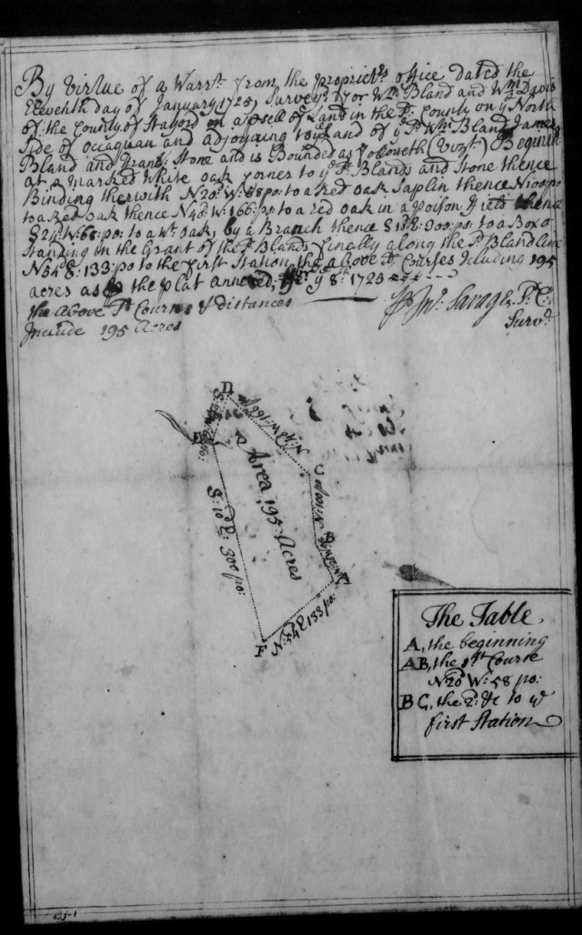 6 – 1726 grant to William Bland and William Davis of 195 acres on N side of Occaquan joining land of said Wm Bland, James Bland, and Francis Stone.