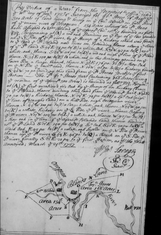 1727 March 25 (survey) – By virtue of a warrt: from the propriet office dated the 11th day of Jan 1725/6 surveyed for Fra. Stone of Staffd Co 300 acres of land lying and being in ye County aforesd on both sides of ye main River of Occoquan; 134 acres whereof the sd Stone hath assigned to William Bland of ye aforesd County which is bounded as follows viz. Beginning at (A) a red oak standing on ye edge of ye low grounds on ye S side of ye sd river, by ye stump of a hickory which was corner to y land ye sd Bland now lives on, estending thence along ye lines of ye sd land … to (D) a red oad nigh ye line of ye sd land … to (F) a Box Oak on ye N side ye rowl. road, …. dividing this land from ye sd Stones part to ye first station … the sd Fra: Stones part containing 166 acres (being ye residue of ye aforesd 300 acres) is bounded as follows, viz, beginning at (A) ye first mention’d red oak by ye stump of an hickory corner to ye sd Bland, thence dividing this land from ye abovesd part … to (H) a Spa: Oak (nigh ye line of Waughs land) on a hillside nigh Occoquan River… to (M) a Box Oak in ye line of ye aforesd Blands landthence binding with ye sd land .. on ye N side ye sd river … to ye first station, as … the platt annexed; March ye 25th 1727. Jno. Savage, Sta:d Co. surveyr. Stafford County, Va Surveys