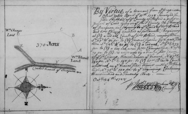 1728 Oct 24 (survey) – By virtue of a warrant from ye proprietors Office dated April 11th 1728 surveyed for John Shubbard of ye County of Stafford a piece or parcel of land lying in ye said County on ye branches of Occoquon and joyning to ye land of William Bland and William Champ bounded as followeth … corner of William Bland … near William Champ’s line … corner of sd Champ … to William Bland’s corner … thence with ye sd Bland’s line … containing 370 acres.