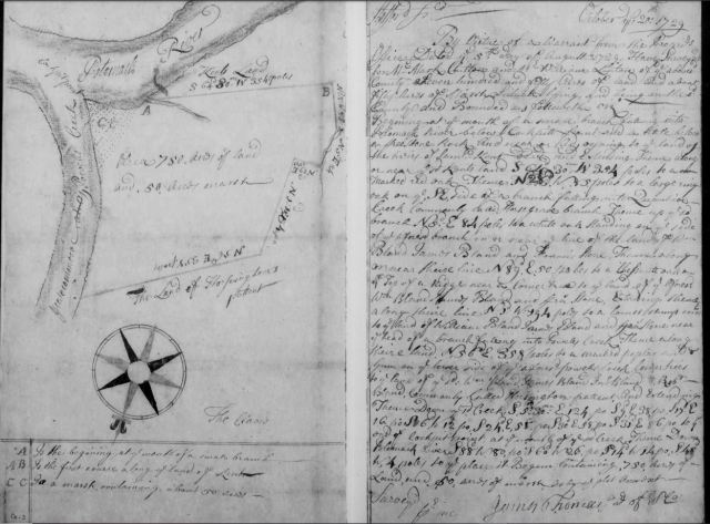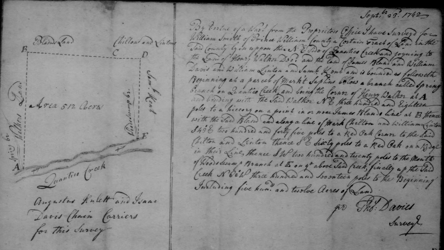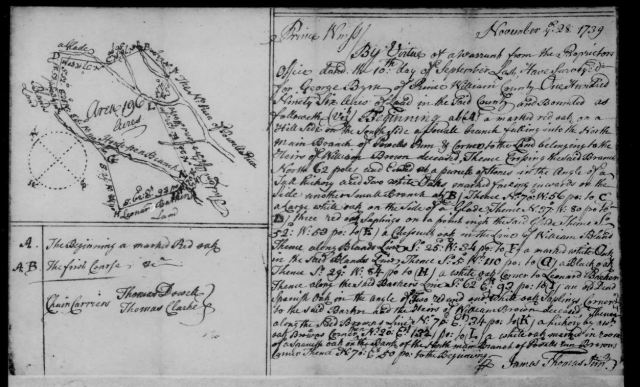 1729 Oct 20 (survey) – …. have surveyed for Mr Mark Chilton and Mr William Linton of the abovesd County 750 acres of land and about 50 acresof marsh situate lying and being in the sd County and bounded… mouth of a small branch falling into Potomack River below Cockpitt Point and a little below a freestone rock and near or adjoyning to the land of the heirs of Samuel Kent decd and extending thence along or near the sd Kents land … to a large ring oak on the SE side of a branch falling into Quanticoe Creek commonly called Horsegrave Branch… near the line of the land of said William Bland, James Bland and Francis Stone …. near the head of a branch falling into Powells Creek … to the land of the said William Bland, James Bland, John Bland, and Robert Bland commonly called Horsington Pattent … thence down Potomack River … containing 750 acres of land and 50 acres of marsh … Signed: James Thomas. Surveyor ….