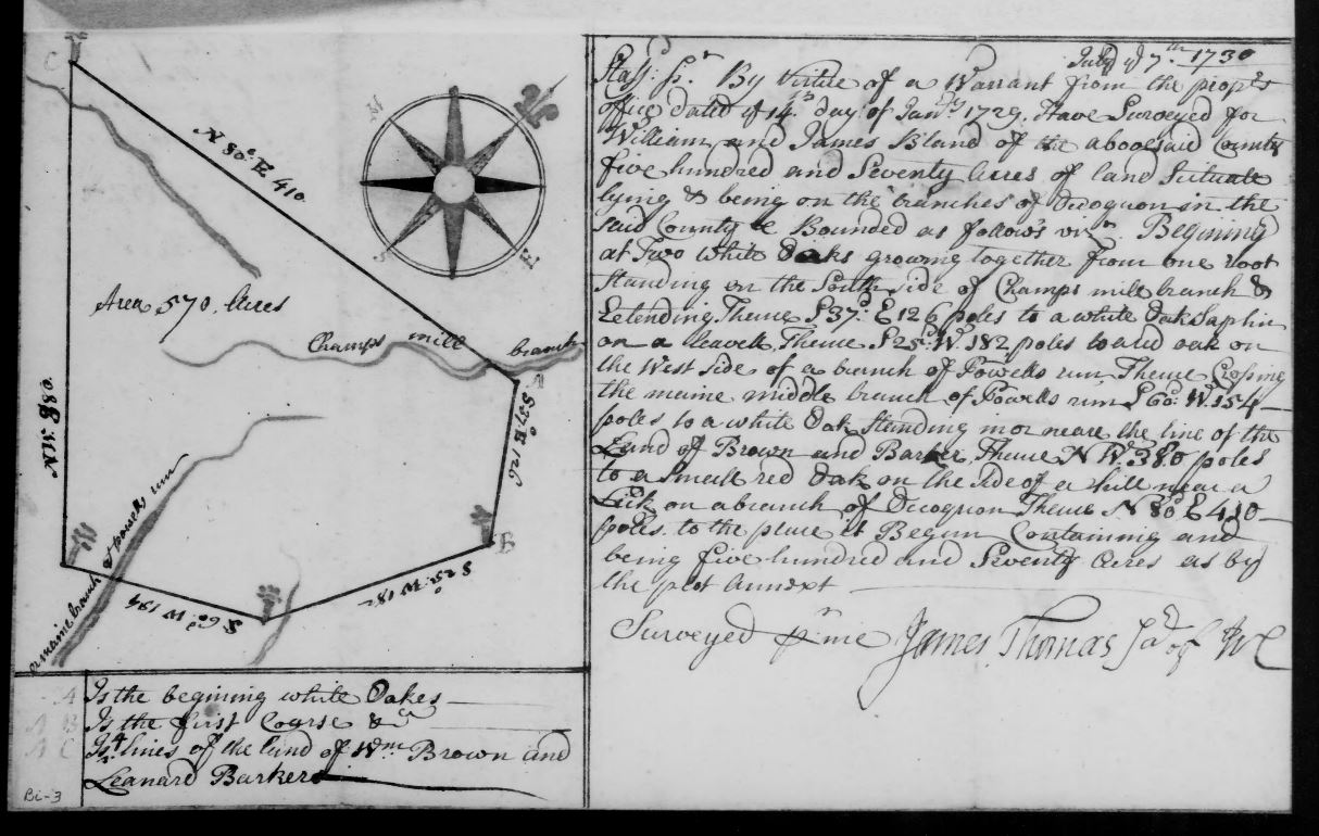 Staffd: Cty. By virtue of a warrant from the Propts Office dated ye 14th day of Jan 1729. I have surveyed for William and James Bland of the abovesaid County 570 acres of land situate lying and being on the branches of Occoquon in the said County … bounded as follows viz. Beginning at twowhite oaks …. on the South side of Champs mile branch and extending thence … to one oak on the West side of a branch of Powels Run thence crossing the Maine Middle Branch of Powells Run …. near the line of the land of Brown (William Brown) and Barker (Leonard Barker) … on a branch of Occoquon … to the place it begun … being 570 acres … Surveyed by James Thomas… Stafford County, Va Surveys