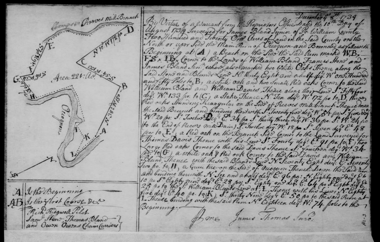 1739 Dec 8 (survey) – December ye 8th 1739. By virtue of a warrant from the Proprietors Office dated the 10th day of August 1739 surveyed for James Bland Junior of Pr William County 221 acres of land in the said County on the North or uper side the Main Run of Occoquon and bounded as followeth. Beginning at (A) a Beach on the side the said Run marked WB, FS, JB, corner to the lands of William Bland, Francis Stone and James Bland Senr, where also marked two White Oaks thence along the said Stone and Blands line …. to a white oak and two small red oaks corner to the said William Bland and William Davis, thence along their line S … on the side of Reeves Mile Branch thence down the said Branch and binding therewith S … to the end of Reeves Mill Dain … to a red oak on the Branch side corner to the land surveyed for Thomas Davis thence with his line S … to two large red oaks corner to the said Davis … to a white oak and red oak corner to the said Davis and William Bland thence with the said Bland’s line… to a Gum tree on the side of Occoquon thence down the said Run … to the sd William Bland’s line … James Thomas Survr. Richd Ridgwell pilot. Saml Stone, Thomas Bland and Owen Owens chain carriers. Prince William County, Va. Surveys.