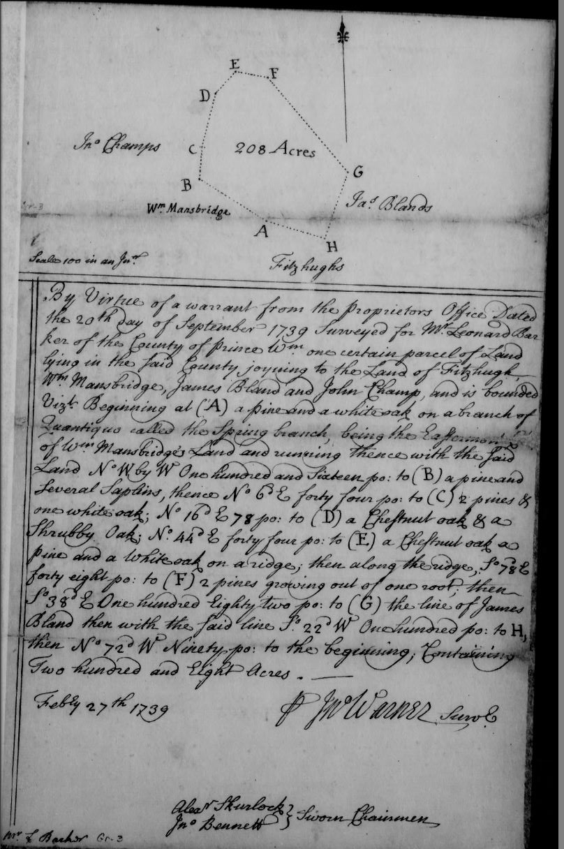 1739 Nov 28 (survey) – By virtue of a warrant …. have surveyed for George Byrn of Prince William County 196 acres of land ... a small branch falling into the North Main Branch of Powells Run and corner to the land belonging to the heirs of William Brown deceased .. crossing the said Branch … at a parcell of stones … in the line of William Bland …. corner to Leonard Barker …. corner to the said Barker and the Heirs of William Brown deceased … Signed: James Thomas surv. Chain carriers: Thomas Dowell, Thomas Clarke.