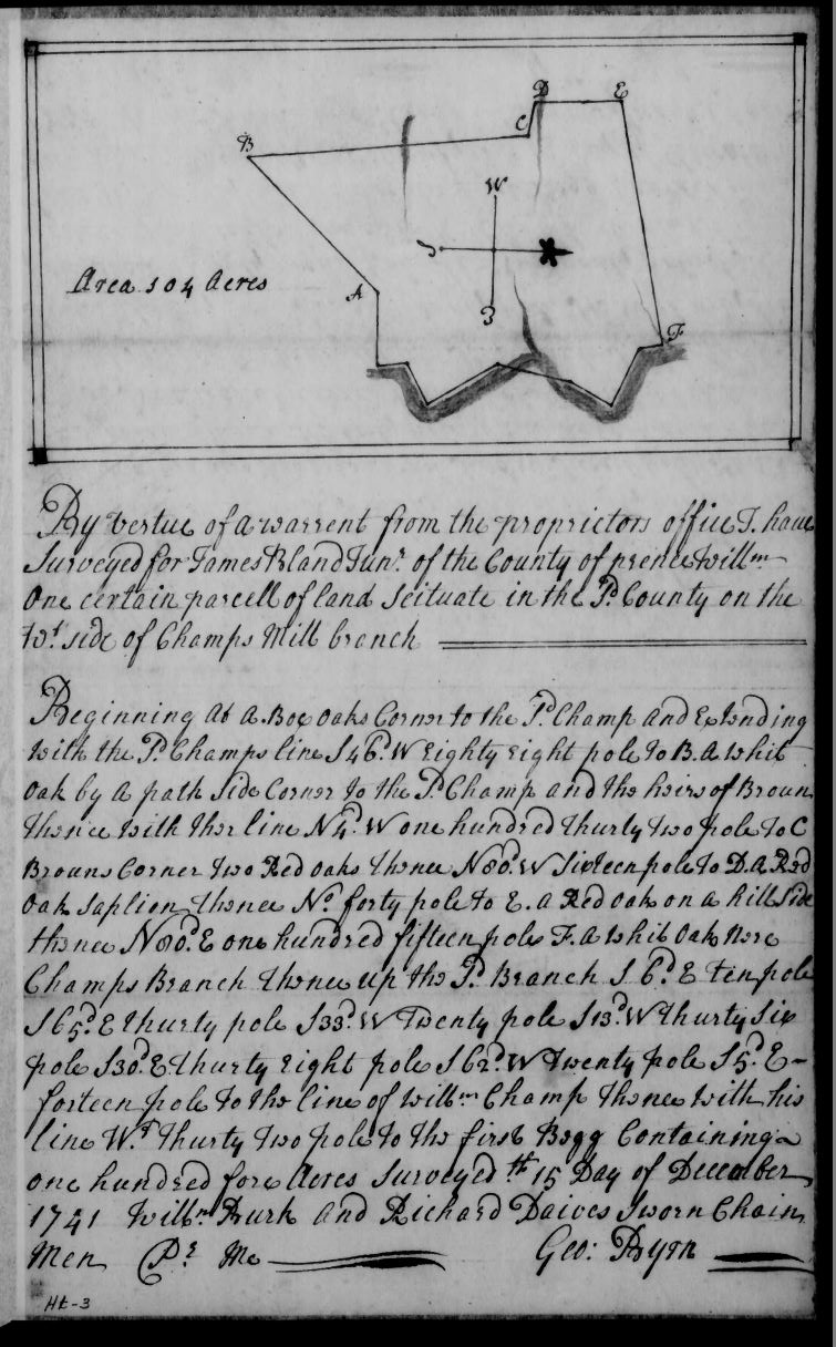 15 – 1743 grant for 104 acres to James Bland the Younger, adjacent Champs Mill Branch west side
