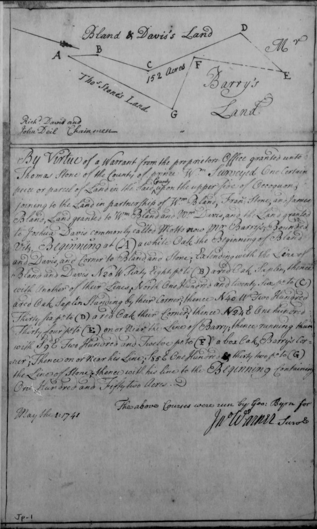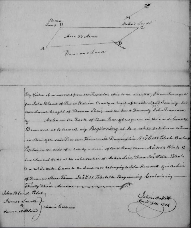1774 April 15 (survey) – By virtue of a warrant from the Proprietors office to me directed, I have surveyed for John Bland of Prince William County, a tract of waste land joining his own land bought of Thomas Stone, and the land formerly John Duncans… in the Fork of Bull Run and Occoquan in the said County .. bounded as followeth, viz, Beginning at a White Oak corner to Francis Stone and the said Duncan, thence with Duncan’s line …. on the side of a hill by a drain of Bull Run … at the intersection of Moles’ line … corner to the land now belonging to John Hammett and in the line of Francis Stone… containing 33 acres. John Moffett, April 15th 1774. James Smith, Samuel Bland, chain carriers. John Bland – pilot. Prince William County, Va. Surveys.