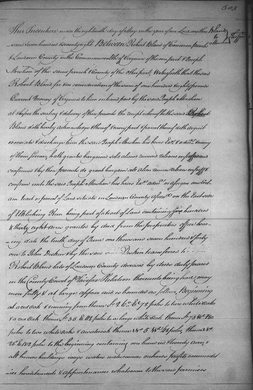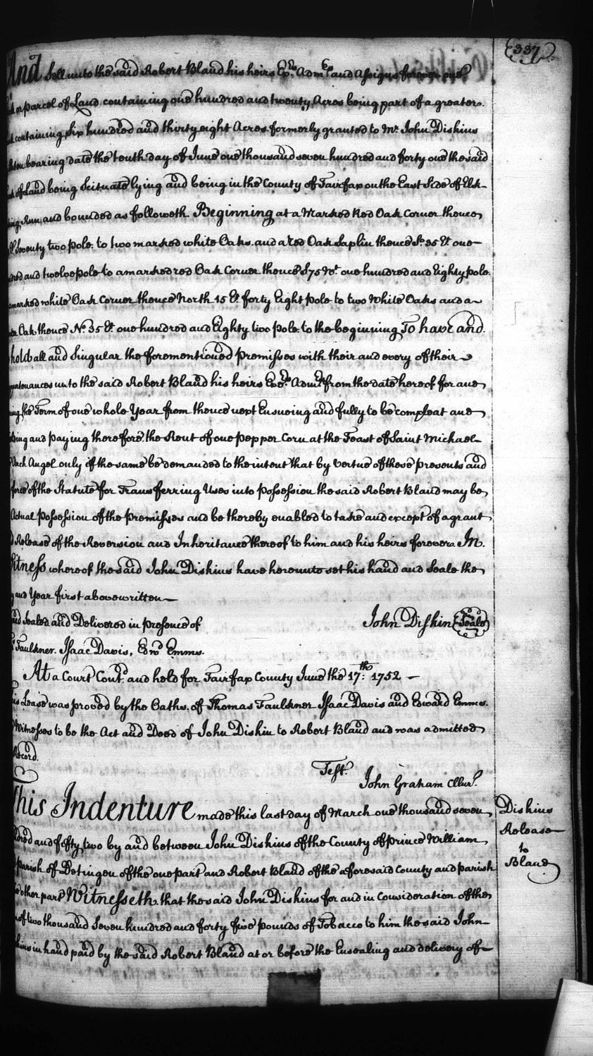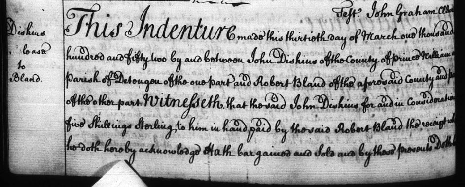 1 – 1752 deed to Robert Bland from John Diskin for 120 acres of a 638 acre tract on Elk Licking Run in Loudoun Co, Va (previously Fairfax – on border)
