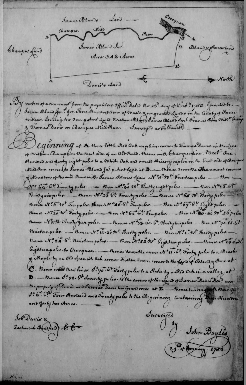 1754 Jan 29 (survey) – By vertue of a warrant from the proprietors office dated the 23d day of Febry 1753. Granted to James Bland Jr for 300 acres of waste and ungranted lands in the County of Prince William joining his own patent land, William Bland, James Bland Sr, Francis Stone, William Champ, and Thomas Davis on Champs Mill Run. Surveyed as followeth: