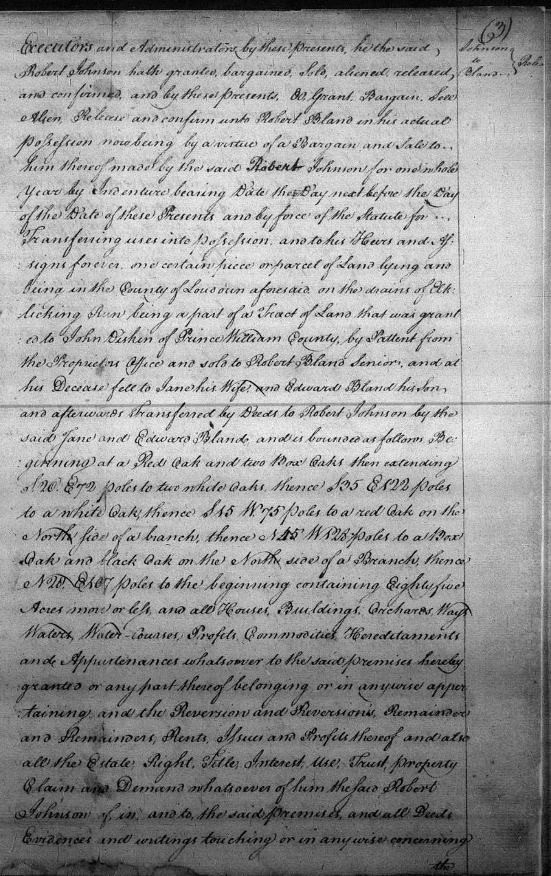 4 – 1775 Robert Johnson to Robert Bland, 85 acres on Elk Licking Run prev sold by John Diskin to Robert Bland, then when he died to his wife Jane Bland and his son Edward Bland who then sold land to Robert Johnson