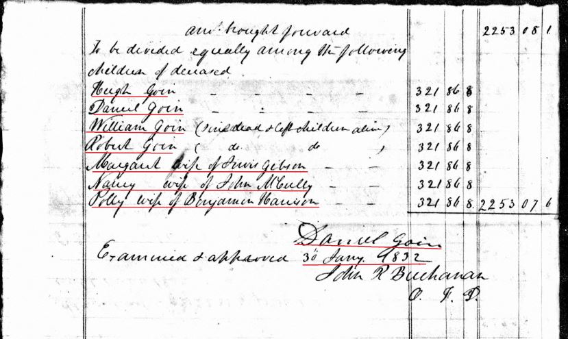 “Daniel Gowens” made his will in January 1818 in Fairfield County. Named in the will were his wife Jean and his seven children: Hugh, Daniel, William, Robert, Margaret, Nancy, and Polly, according to Fairfield County Will Book 5, page 231.