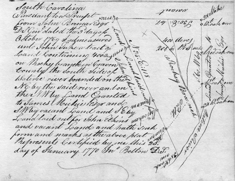 …pursuant to a precept … dated the 3d day of October 1769 … unto John Tuke a tract of land containing 400 acres on Rocky Branch in Craven County the S side of Wateree River bounded on the NE by the said River and on the NW by land granted to James Michie Esqr and SW by vacant land and SE by land laid out for John Elkins and vacant land … Certified by me this 25 day of Jan 1770 John Belton DS. Craven County, South Carolina.