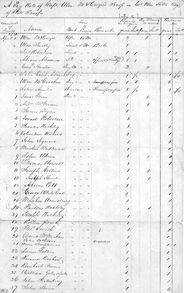 1782 April 5 – Pay Roll In Slaves Of Captain William Mckenzies Troop In Colonel William Hills Regiment Of State Troops (2 Pages) Date: 1782 C.