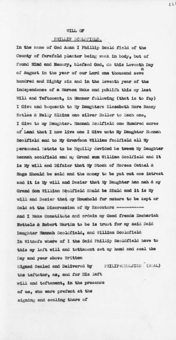 1786 – Scoldfield, Phillip 0F Fairfield County, Kershaw County Will Typescript (Mss Will: Camden District Estate Record Book A1, Page 352; Estate Packet: Apt. 61, Pkg. 2172) (2 Frames). Date: 1786