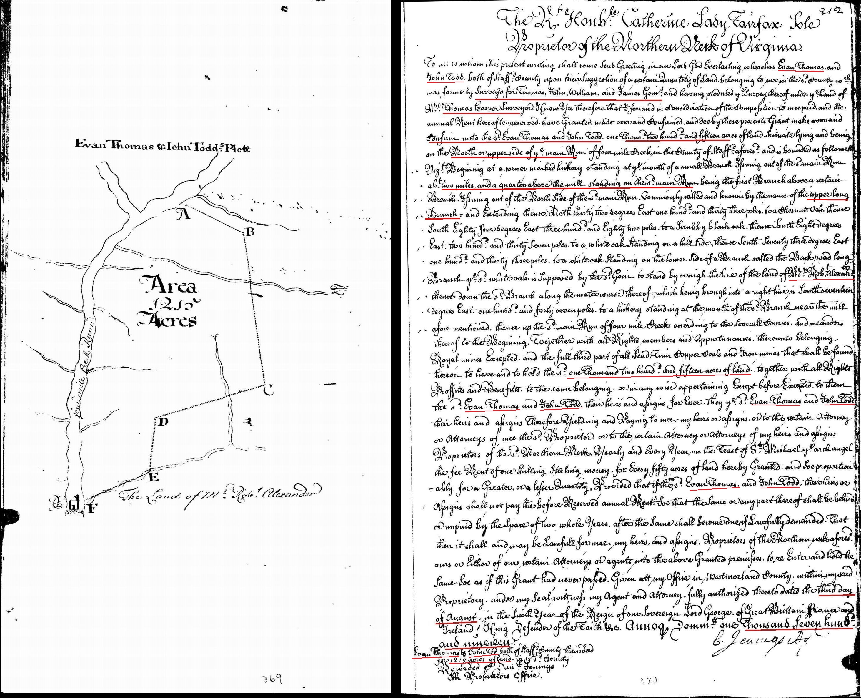 (Note: Additional information about this 1215 acre grant can be found on Thomas Gowing’s page, including copies of depositions in 1767 regarding lawsuits that arose out of the ownership of the land after Alexandria, Virginia was established. (For additonal information see: Thomas Gowing’s page).
