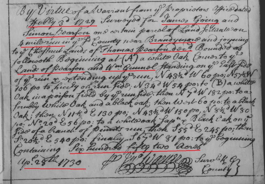 1730 Apr 28 survey of James Going and Simon Pearson for 652 acres in Stafford Co Va:
