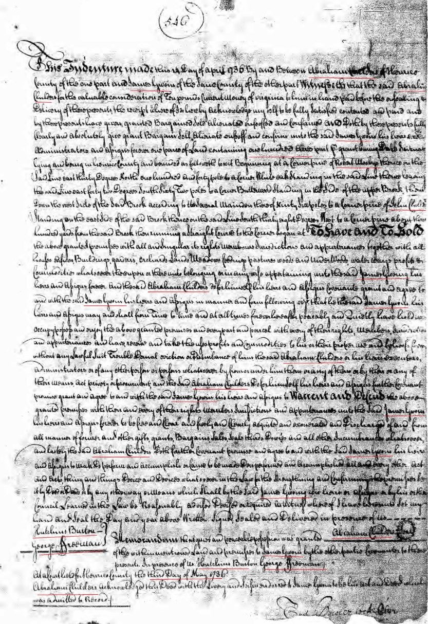 … in consideration of 10 pounds current money … unto the said James Gowins …. 100 acres .… in Henrico County… beginning at a corner pine of Robert Mosely thence on the said line east … to a corner white oak standing in the said line thence … to a corner butterwood standing in the side of the upper Brook thence down the west side of the said Brook … to a corner pine of John Childers standing on the East side of the said Brook… Signed: Abraham Childers. Wit: Hutchins Burton, George Freeman. Proved up on May 3, 1736 …