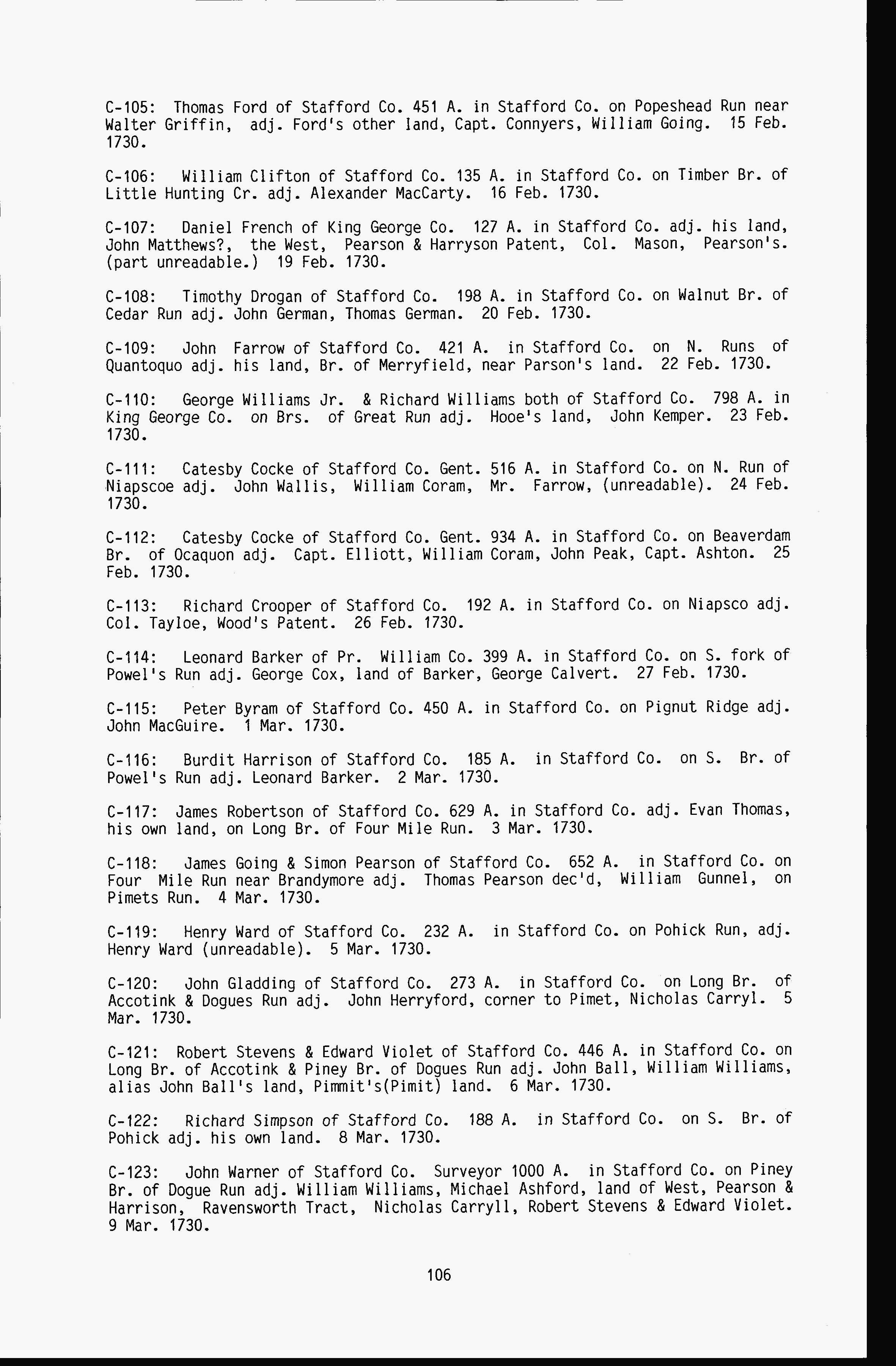 1730 March 3 James Going and Simon Pearson recv 652a in Stafford Co