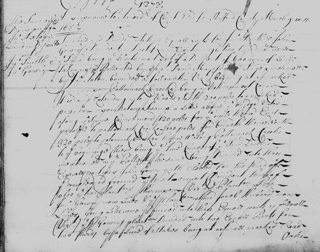 The Depon of GERRARD LOWTHER of yee County aged thirty yeares or thereabouts sayeth that upon his Journey to JAMES TOWNE in Compa with Mr, THO GREGG of ye sd County & Mr, NELSON, this Depts_ with ye sd Compa went to ye house of one MR, HEARD who marry’d MARY Widdow & Relict of HENRY BLAGRAVE & Daughter of Capt. DAVID MANSFIELD where this Dept. & ye sd Mr. GREGG the sd NELSON entered into discourse with ye sd MARY concerneinge ye Sale of Six hundred acres of land situate & being on ye South side of POTTOMACK CREEKE in this ye sd County and sd MARY …. her sd husband BLAGRAVE to JNO. AXTON & EDW CARY late of ye sd County (part whereof is still in Question) MARY declared yet she & her sd Husband BLAGRAVE sold ye sd Six hundred acres of land to ye sd JOHN AXTON & EDWD. CARY & yt her sd husband did acknowledge the Deede of Sale thereof to AXTON & CARY at ye Genll. Court at JAMES TOWNE, and further declared yt for the sake of her said husband BLAGRAVE she would truely have parted wth all shee hade or words purporting ye same & further Deposeth that this Descourse was some few days after sd GOWRY had purchased ye sd Land & that she then further Declared yt ye sd GOWRY had cheated her Sone in Lawe & that he should not have the sd Land nor any other hereof ye sd AXTON & further deposeth not