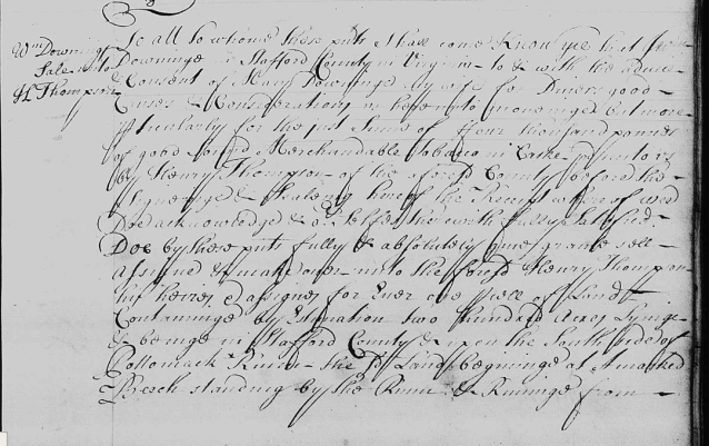 1687: pp. 71a-72 TO ALL Know ye that I WM. DOWNINGE of Stafford County Virginia with the Consent of MARY DOWNINGE my Wife for Divers good causes but more particularly for the sume of four thousand pounds of good sound merchandable Tobacco in Caske paid unto us by HENRY THOMPSON of the aforesd County grant unto the sd HENRY THOMPSON his heires forever two hundred acres of land in Stafford County upon the South side of POTTOMACK RIVER the sd land Begininge at a marked Beach standing by the River & runninge from thence Southerly into the Woods Easterly to a marked white cake upon the River well sd land is the Westinmost part of One thousand four hundred & fifty acres of land but by the said DOWNINGE of JOHN PEAKE; To Have and To Hold the said land In Witness whereof we have sett our hands & Seales this 9 of Novembr 1687