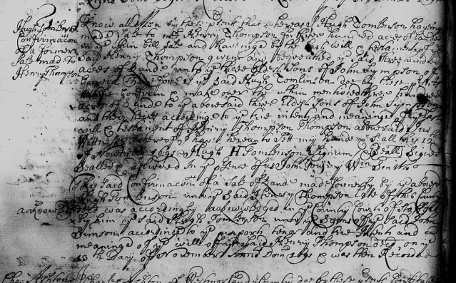 1691: p. 217a KNOW ALL MEN by these presents that Whereas I HUGH TOMLINSON haveinge made sale to Mr. HENRY THOMPSON of three hundred acres of lande in ye within Bill of Sale and haveinge by the Last Will and Testament of ye said HENRY THOMPSON given and bequeathed ye said three hundred acres of lande unto ye three Eldest Sons of JOHN SYMPSON of OCOUIA therefore I ye said HUGH TOMLINSON doe by these presents make over the within mentioned three hundred acres of land to ye abovesaid three Eldest Sons of JOHN SYMPSON and their heires according to ye meaninge of ye last Will and Testament of HENRY THOMPSON abovesaid. In Wittness I have sett my hand & Seale this 12th of November 1691.
