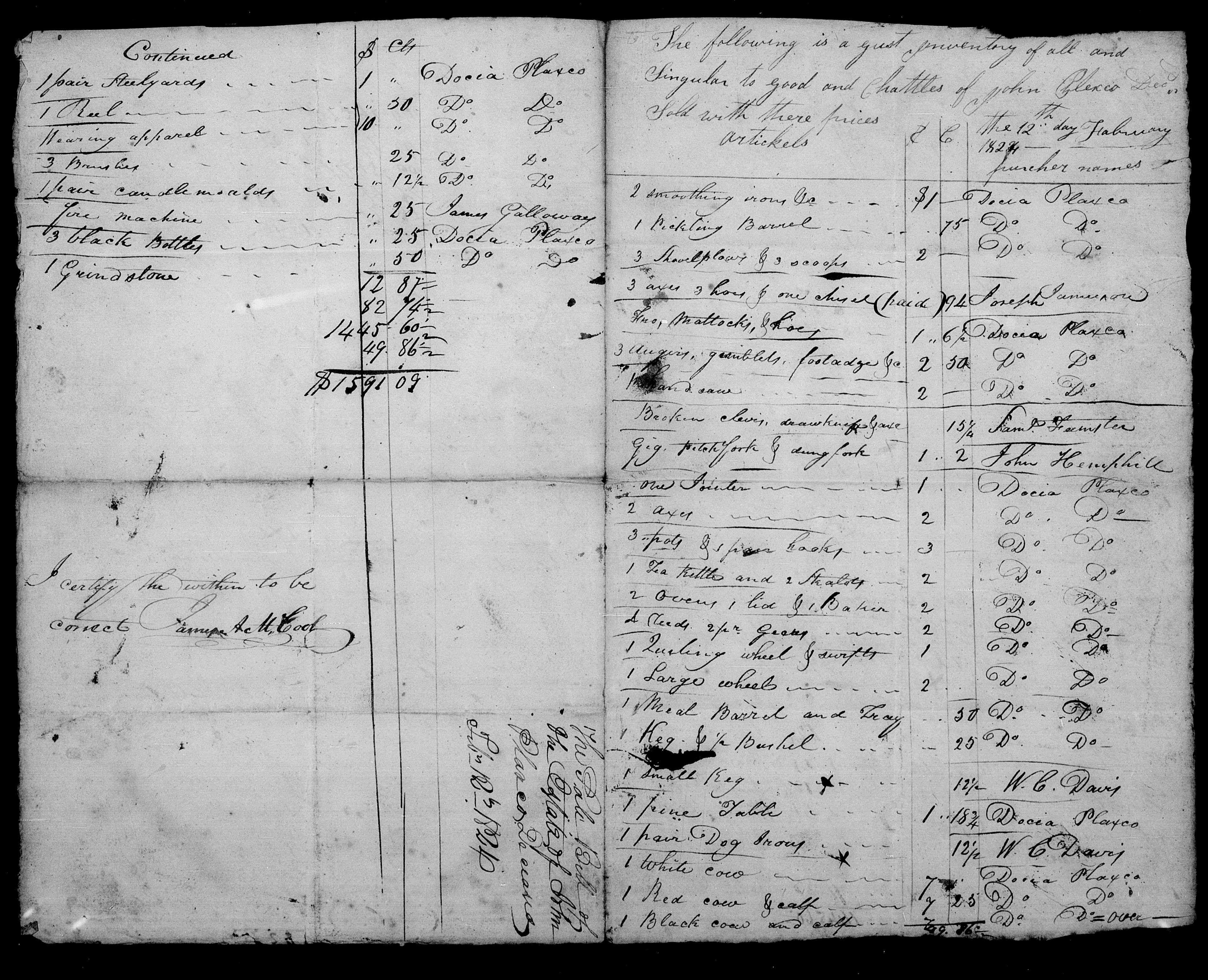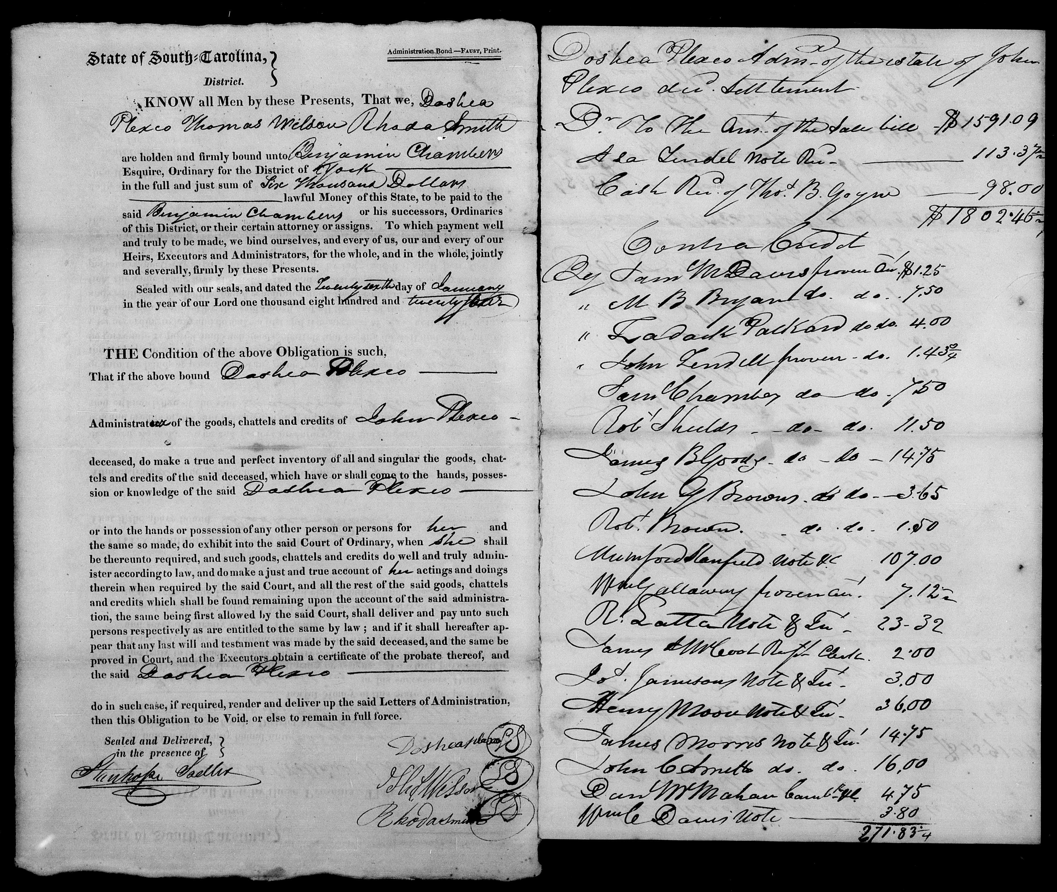 Probate information for John Plaxco, dec’d in 1824 showing relationships between him and Docia Bland (wife), Drury B. Goyen (step-son), Sarah Goen (step-daughter), and Elvira Plaxco (daughter).
