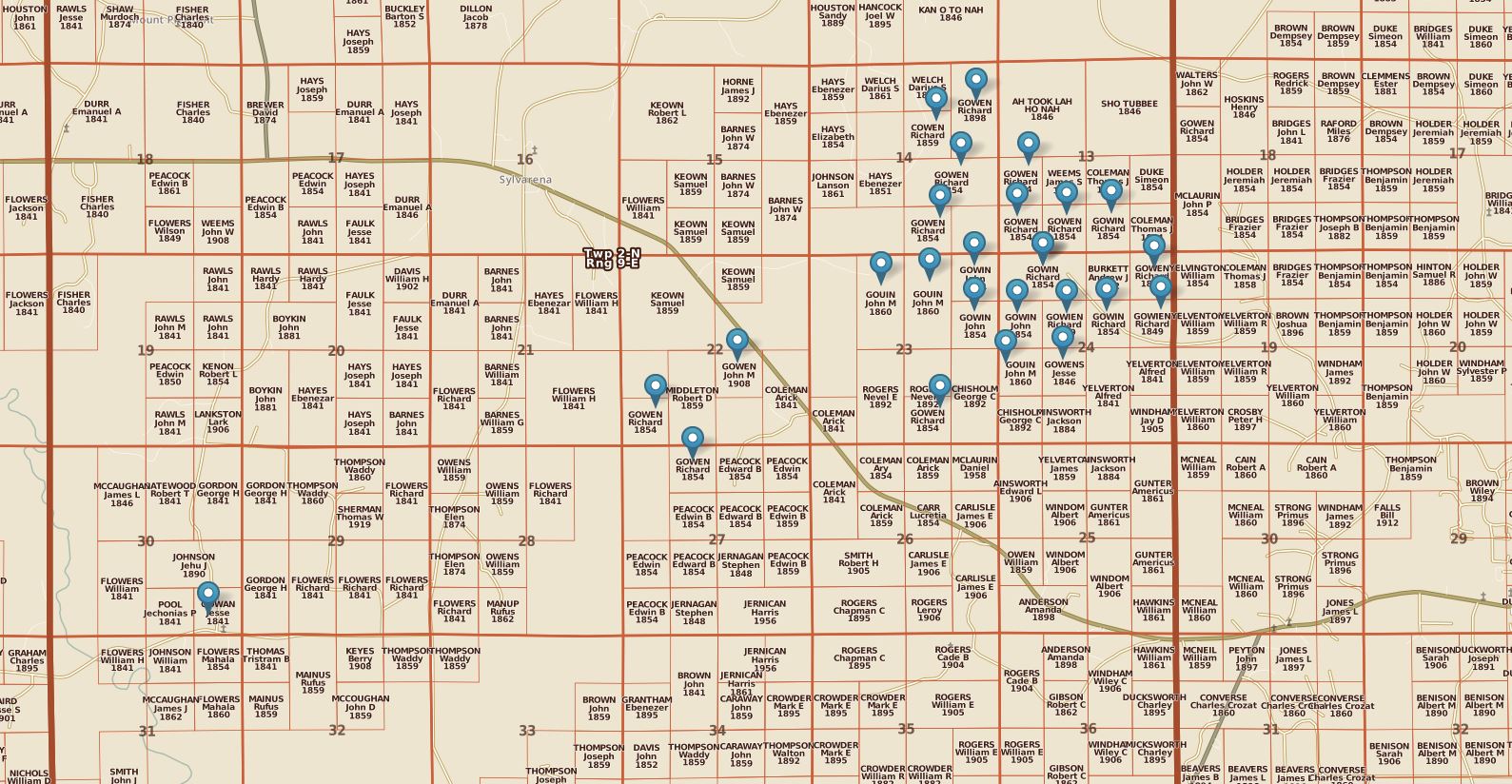 1855 Feb 12 – Richard Gowen purch E half, NE qtr, and SE qtr, NW qtr, Sec 14, TS2, R9, 120.45 acres, 50 cents per acre, purch price $60.23. Cert No. 11716. Supplemental payment $60.22 Oct 13, 1857. Patent book Smith Co, MS. https://www.familysearch.org/ark:/61903/3:1:3QS7-99Q6-7GLW?i=177&cc=2036959&cat=246162