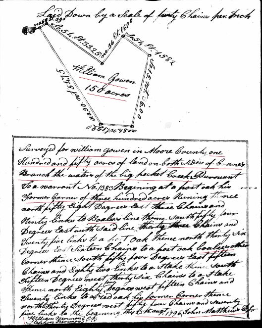 1764 Nov 9 – William Gowen 300 acres Cumberland, on both sides of the Pocket Creek begining at a white oak thence S30 E219 poles to a red oak thence S60 W219 poles to a red oak thence N30 W219 poles to a pine, thencd N60 E219 poles to the begining.