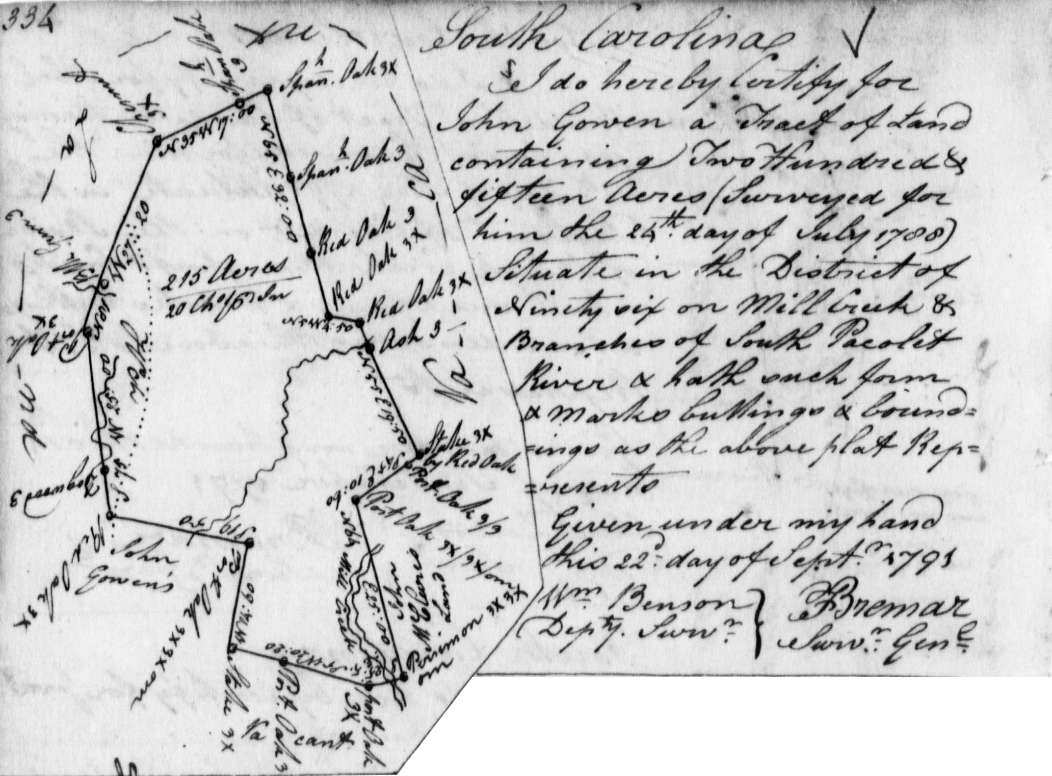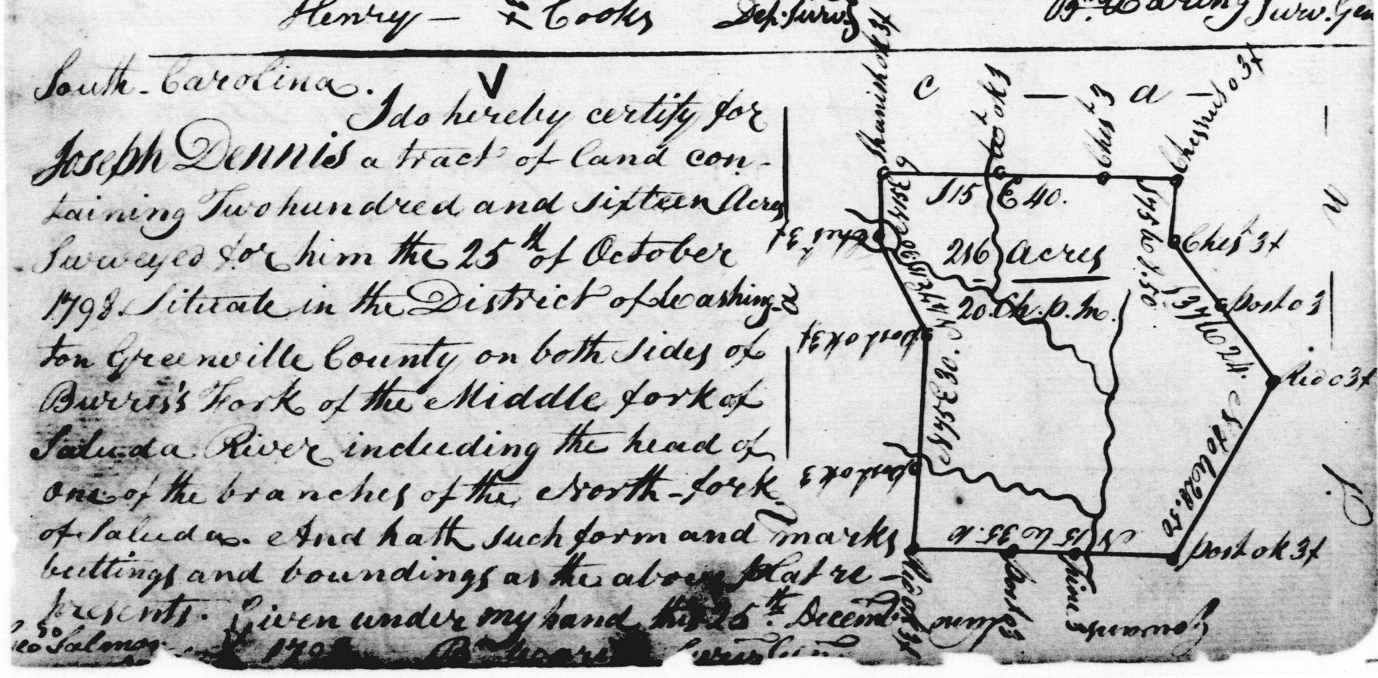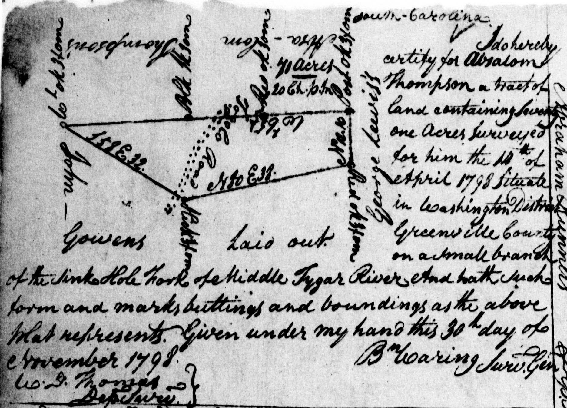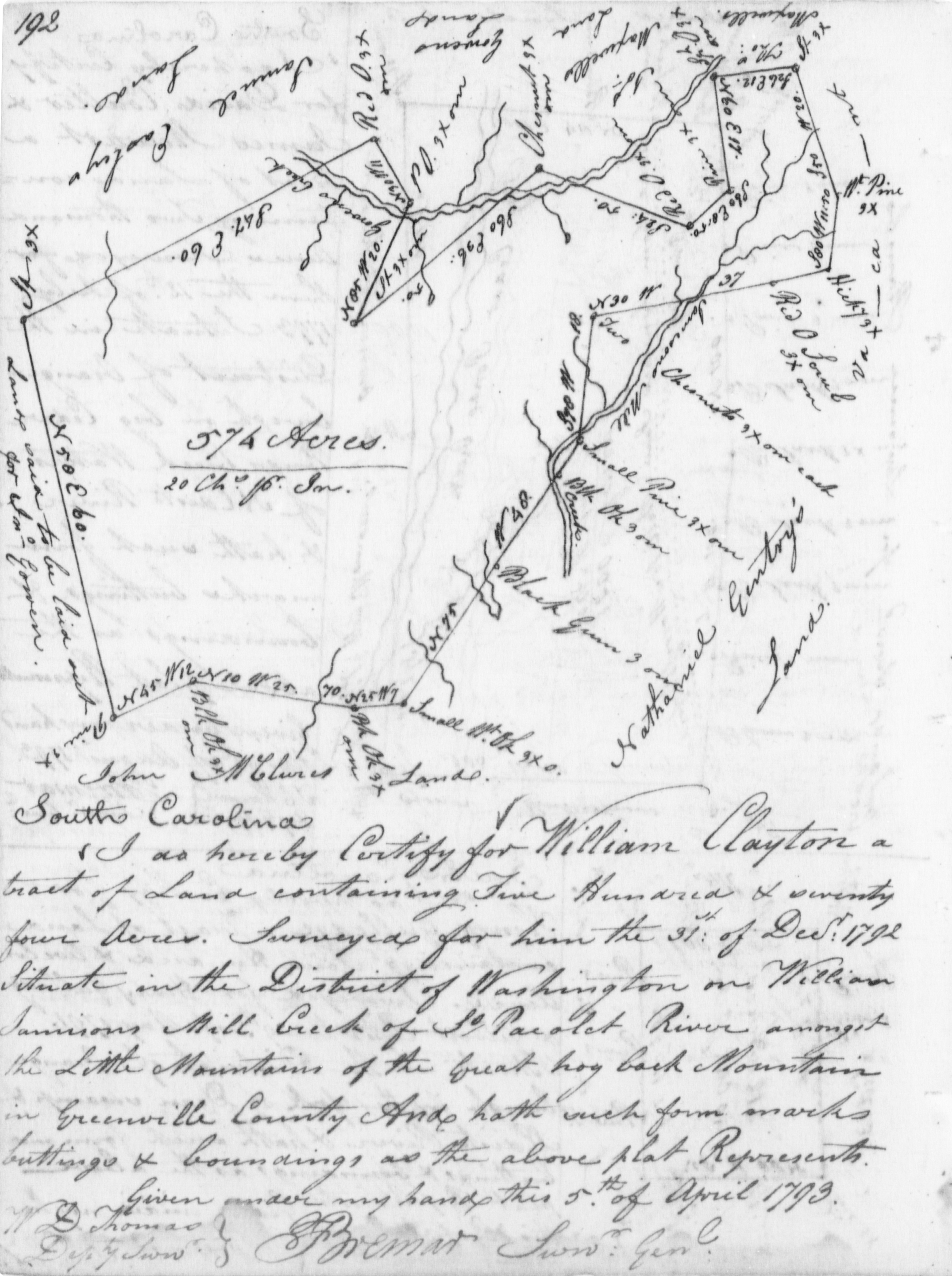 Given under the Great Seal of our Said Province. Witness the Honorable William Bull, Esquire, Lt. Governor and Commander in chief in and over our said Province of South-Carolina, this Nineteenth Day of August Anno Dom. 1774 in the Fourteenth Year of our Reign. [L.M.S.] Williams Bull; Signed by his Honor, the Lt. Governor in Council And hath thereunto a plat thereof annexed, representing the same certified by John Bremar, Deputy Surveyor-General. May 20, 1773. Thomas Winstanley, GCC” Greenville Co., SC