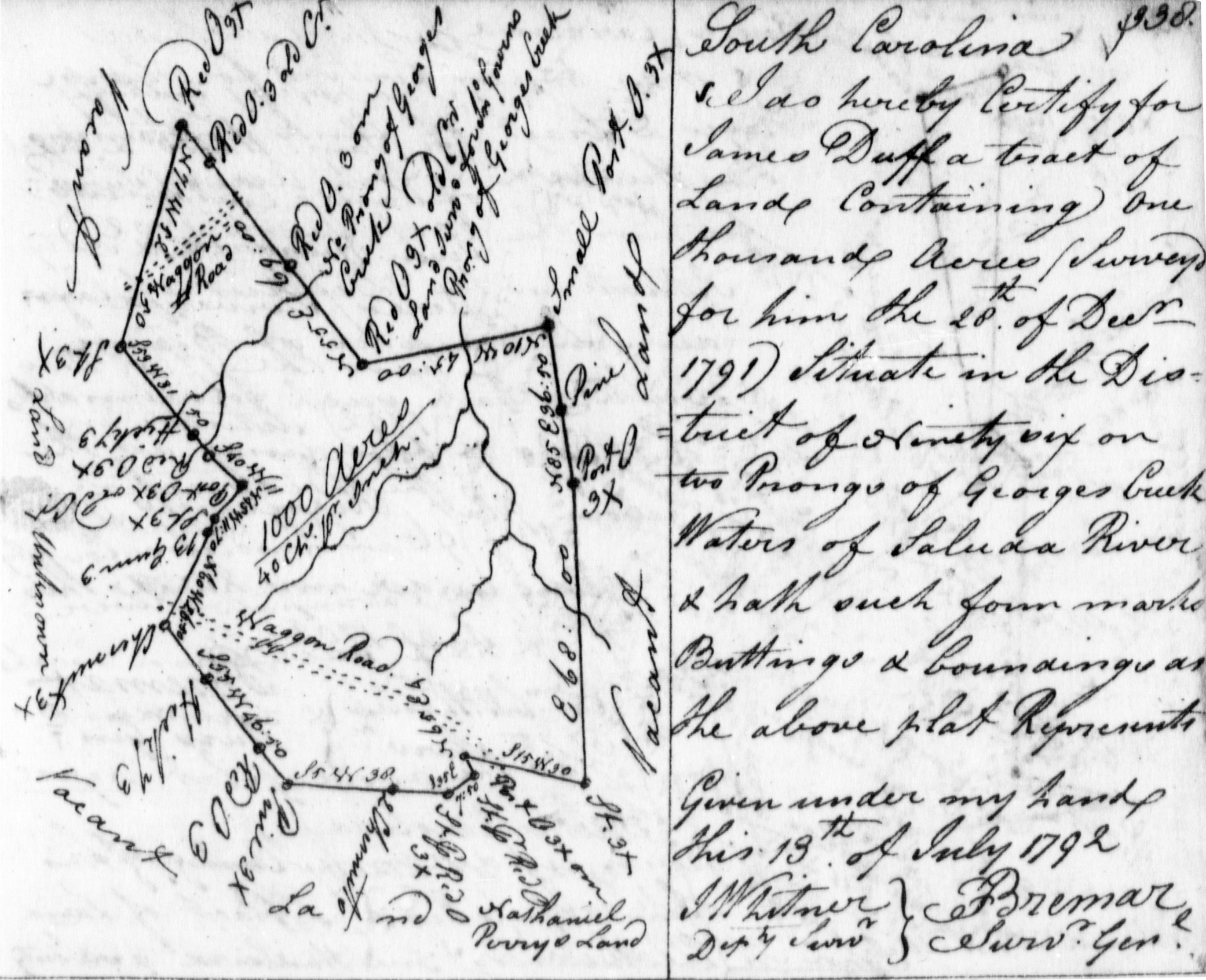 Series: S213184 Volume: 0015 Page: 00157 Item: 02 Names indexed: BREMAR, JOHN; FLATCHER, THOMAS; JOSEPH GOWAN; THOMSON, ANDREW Document type: PLAT Locations: BROAD RIVER; CRAVEN COUNTY; TYGER RIVER, South Carolina.